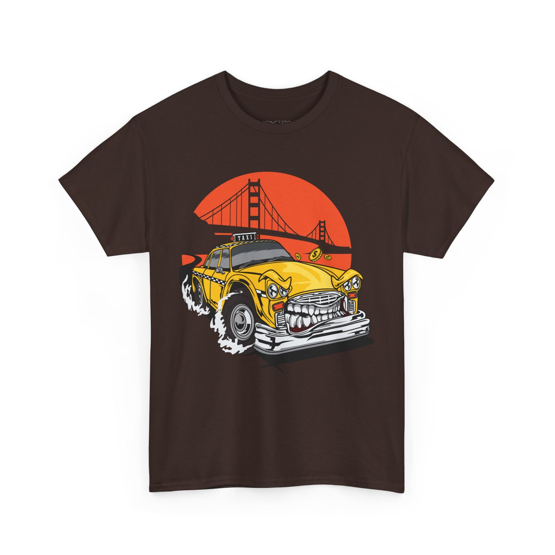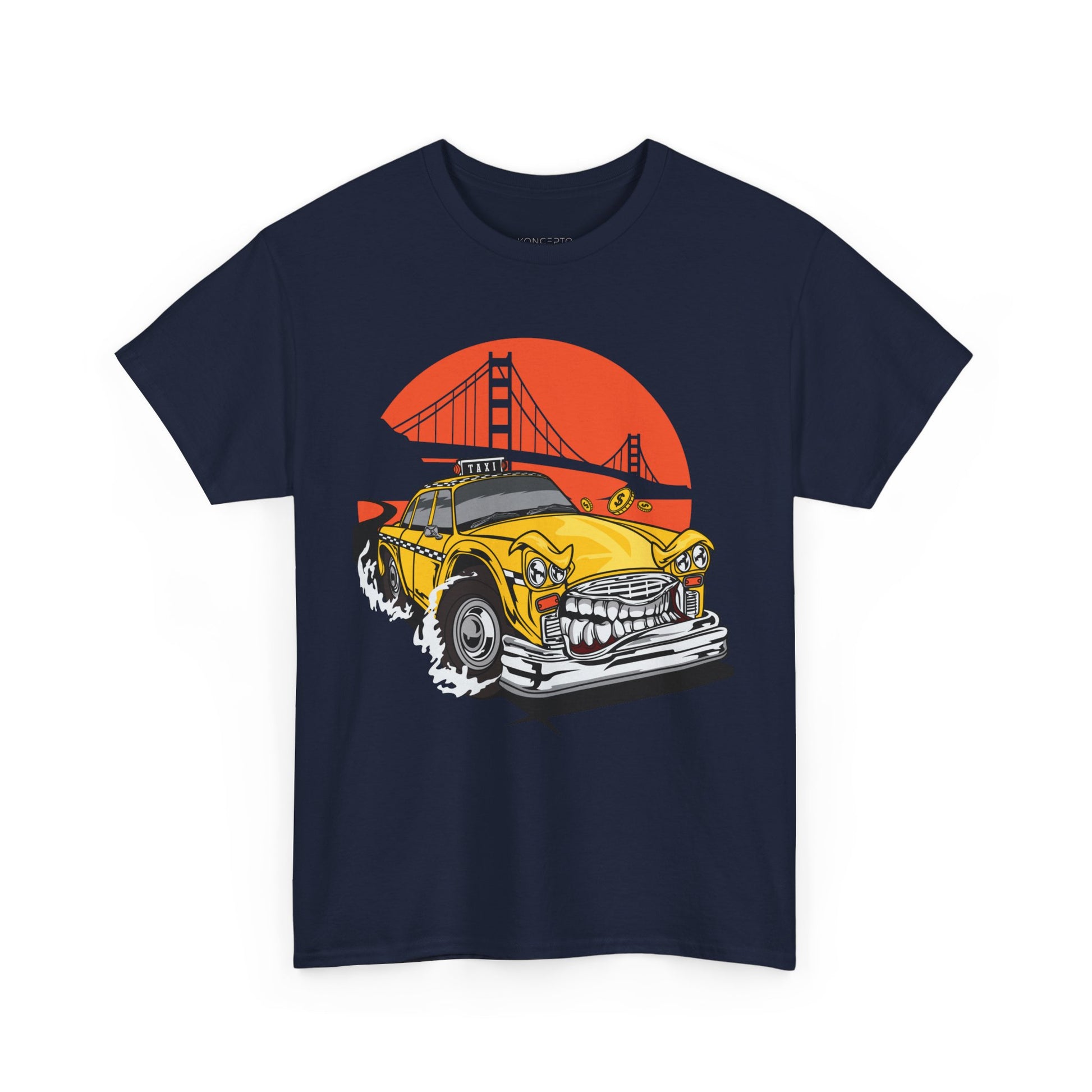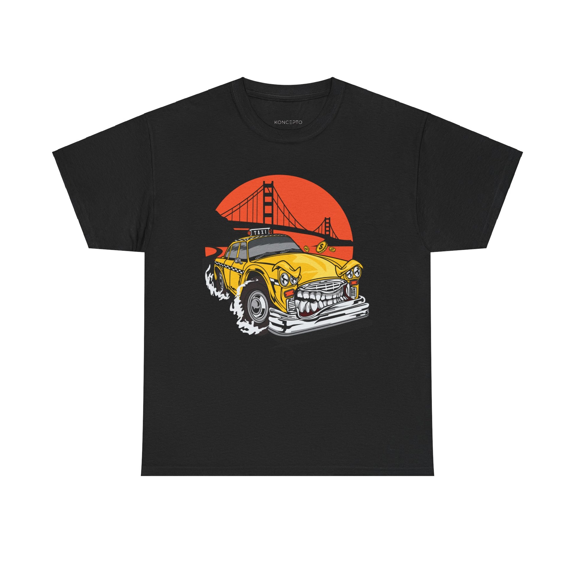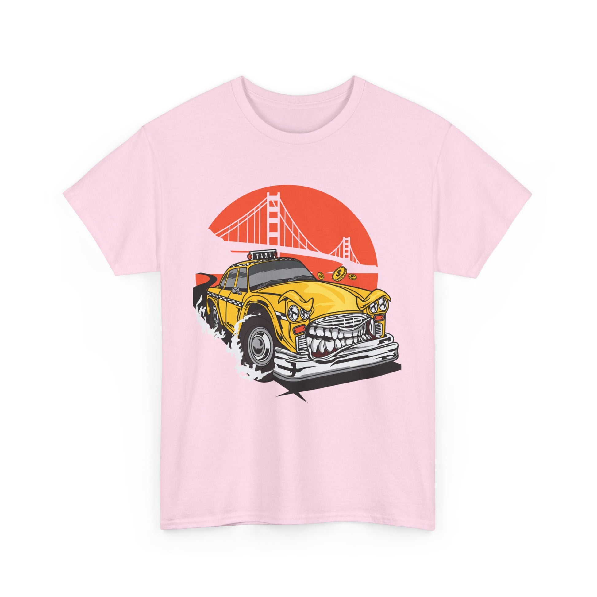 Vibrant Animated Yellow Taxi Art Print Tee - Perfect for city lovers and art enthusiasts, this tee brings a lively cityscape illustration with a bridge to life. Adds a pop of color and personality to any outfit, suitable for casual wear or a statement piece.