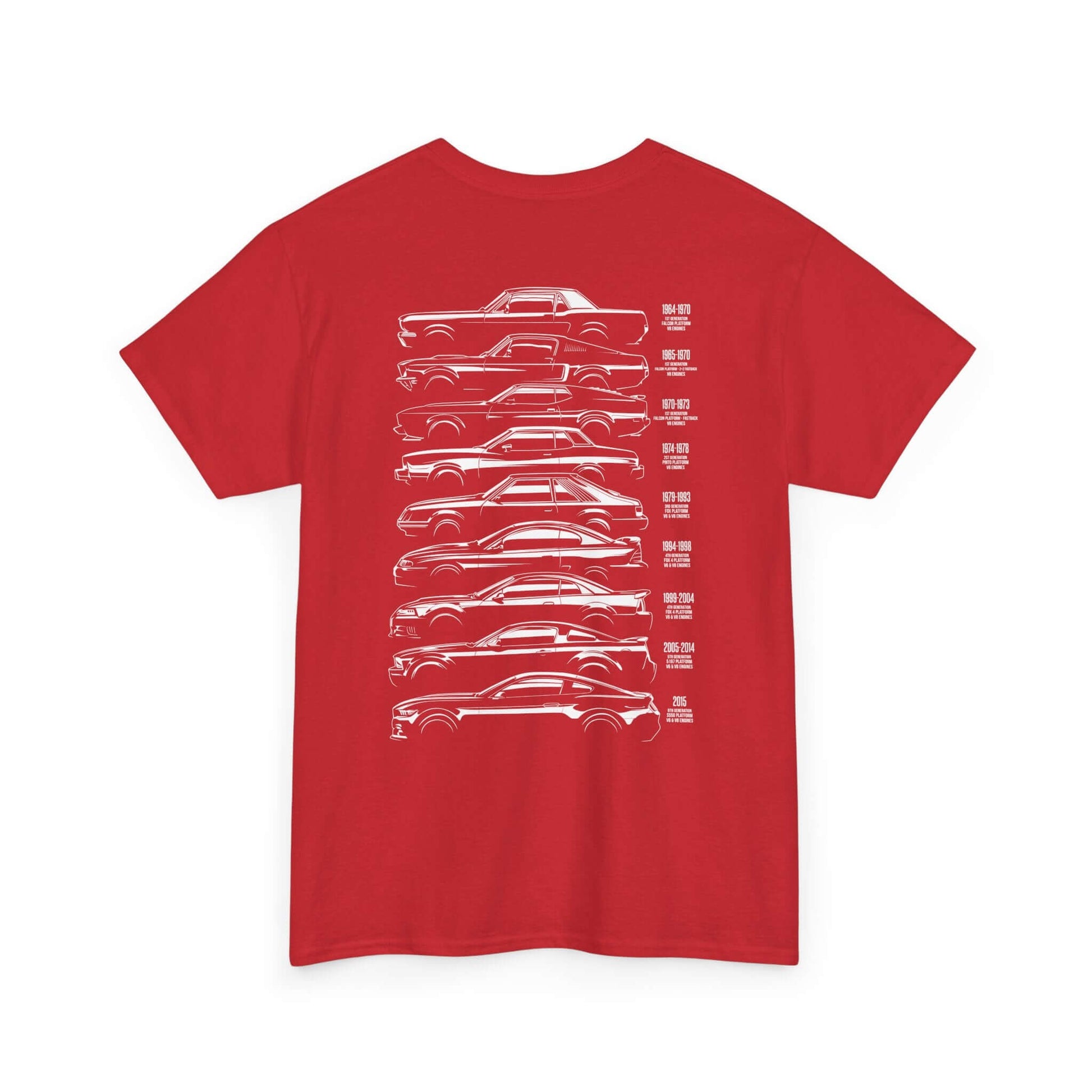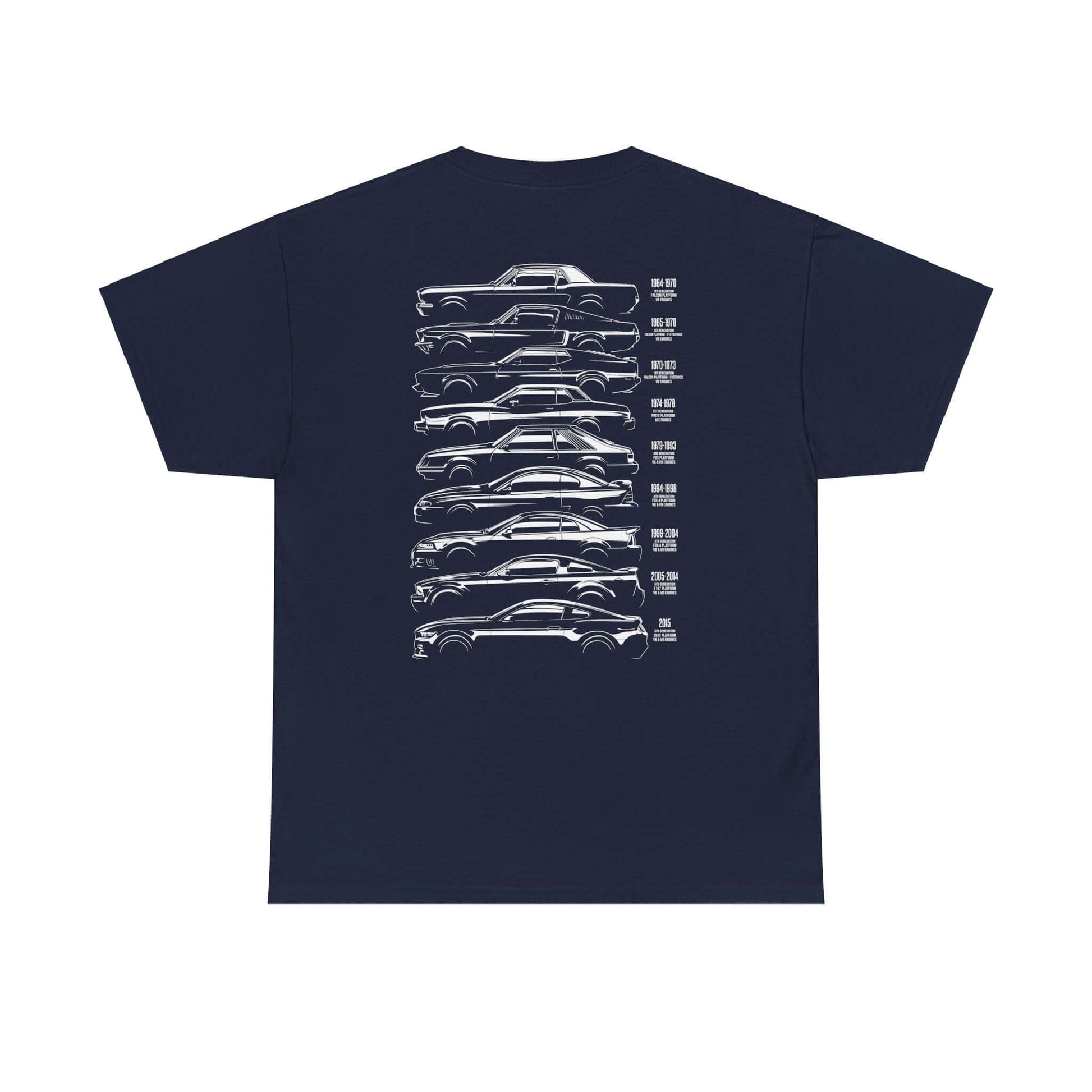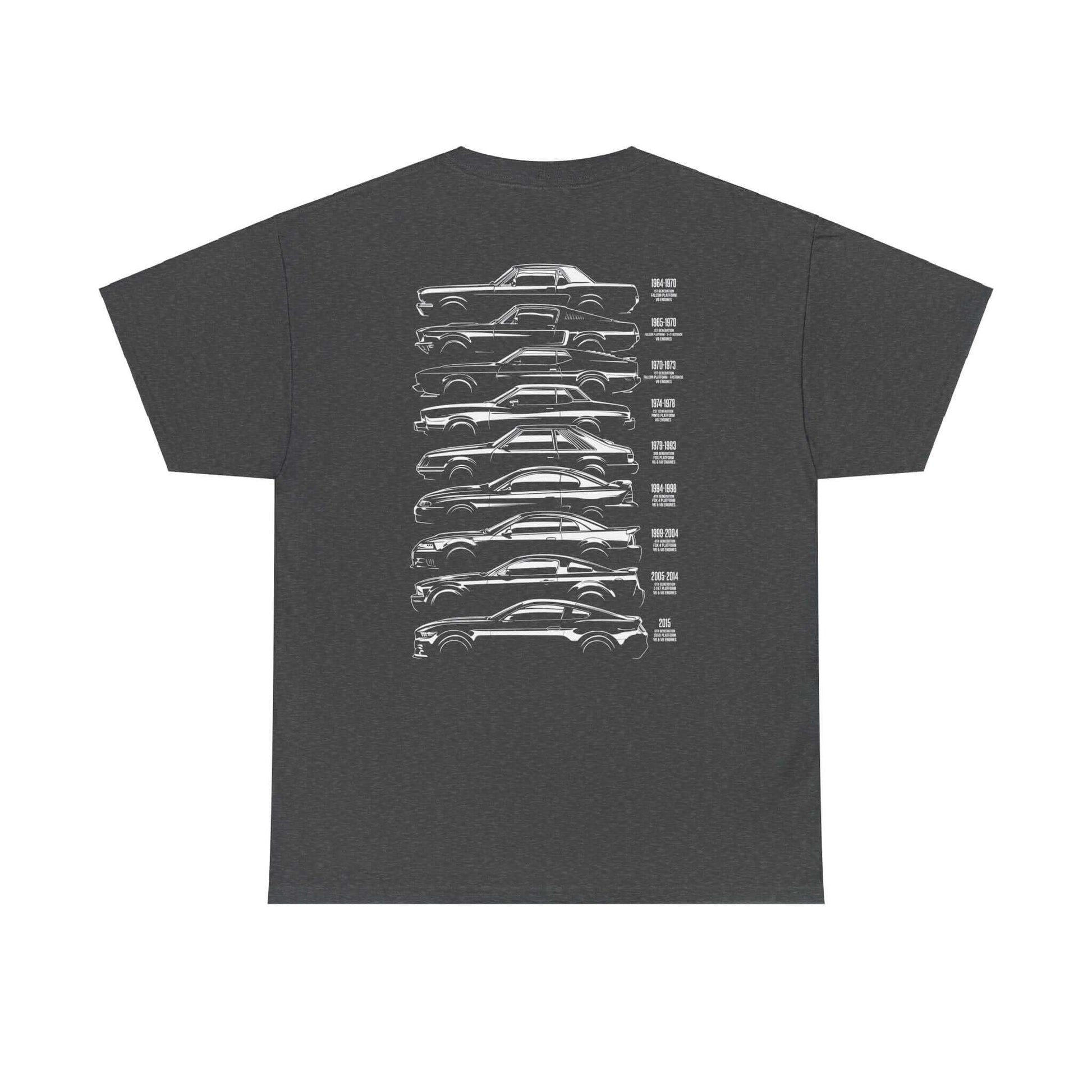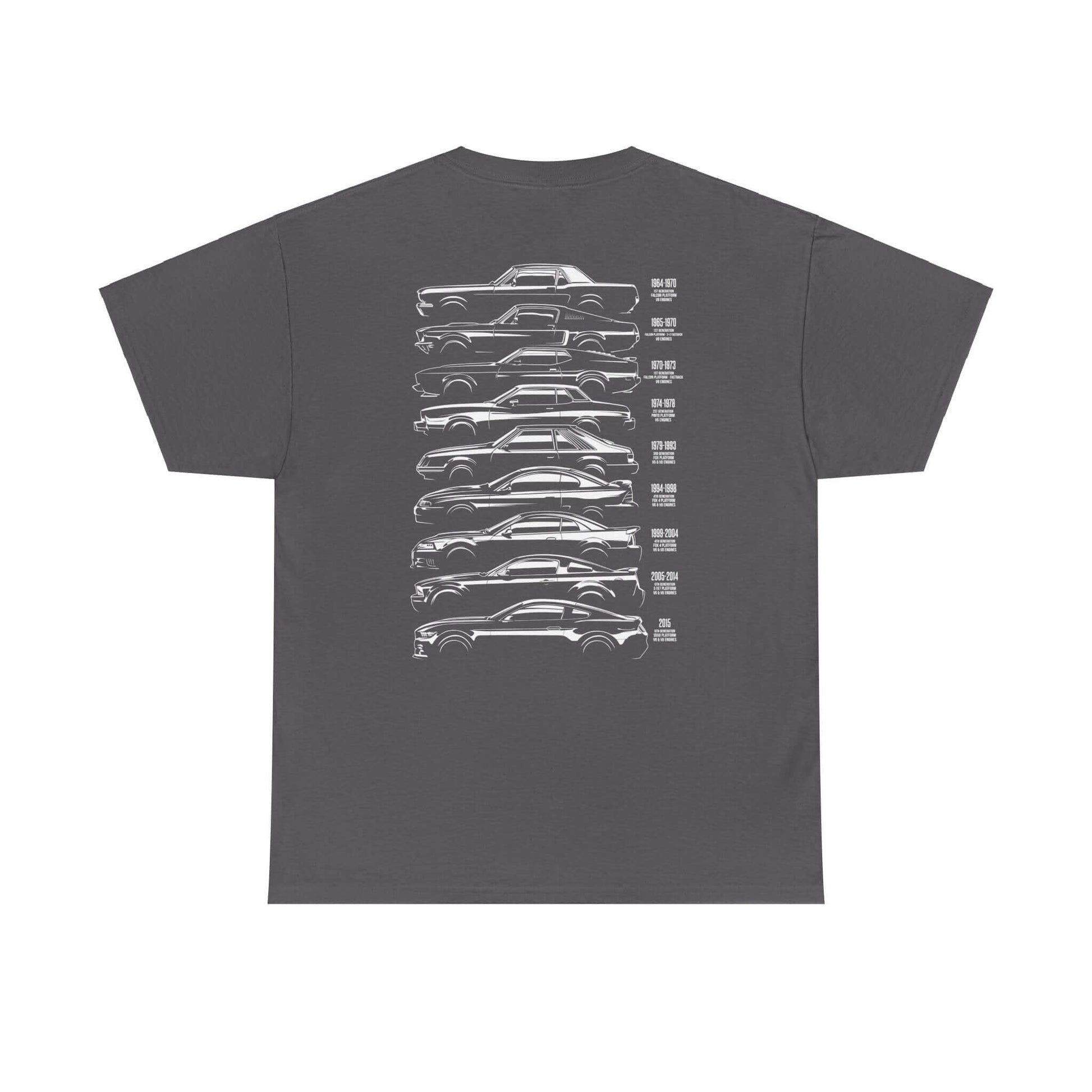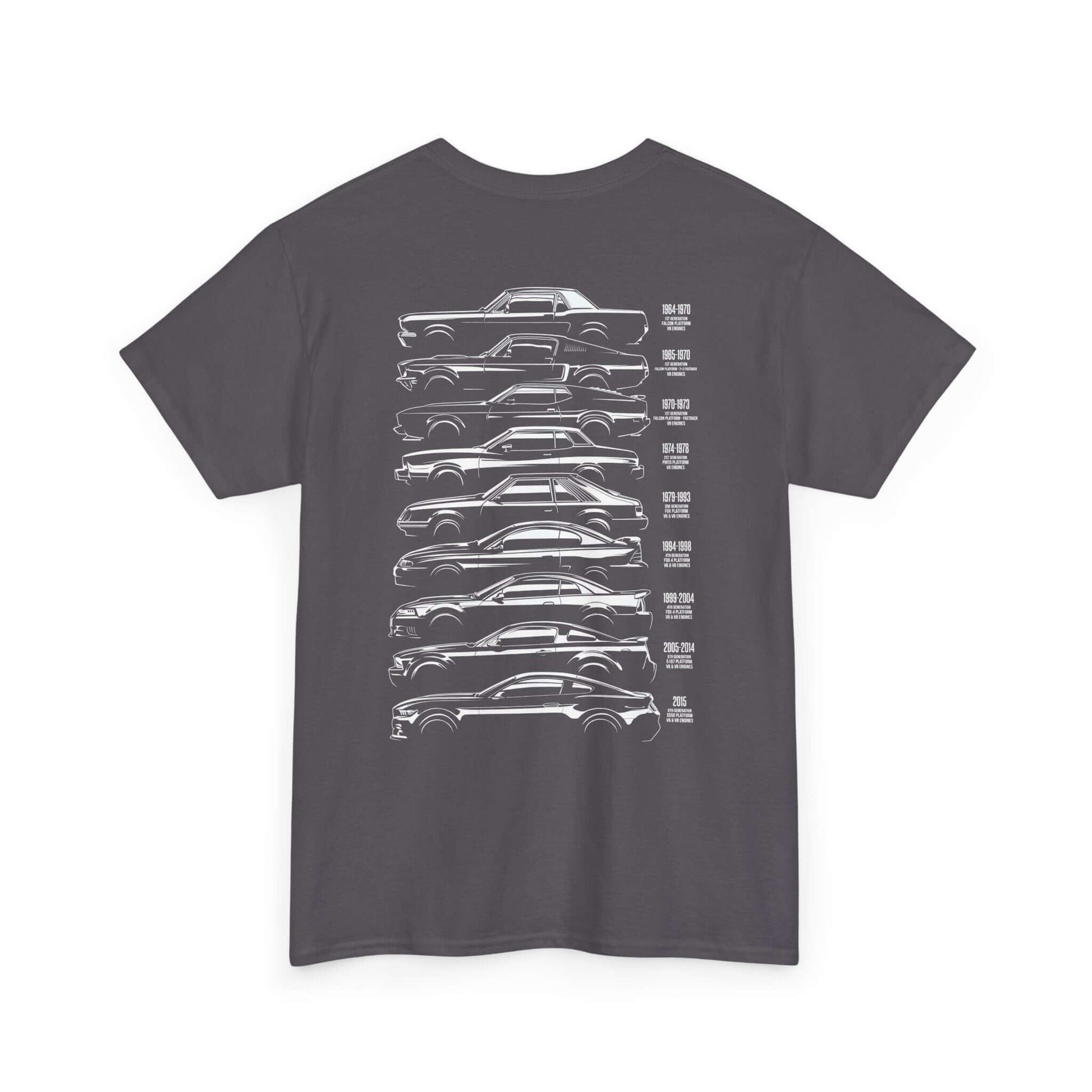 Popular Ford Mustang Evolution Tee featuring a rear and front print design. This shirt showcases a front upper chest print with year-by-year specs, perfect for Ford Mustang enthusiasts. The classic fit and versatile design make it ideal for casual wear or Ford Mustang events and gatherings.
